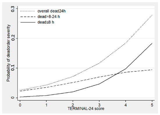 Figure 2). The probability of death was observed as the exponential pattern at a score over 2 in the overall rate of death. The crossing between groups was observed at a score over 3, indicating the separation between the time of death under 8 h and that between 8–24 h (