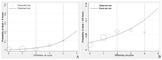 Risk curve of TERMINAL-24 score in (A) the death within 8 h group and (B) the death within 24 h group. The lines represent the predicted risks using TERMINAL-24 score. The circles represent the observed risks, and the size of circles represents the sample size.