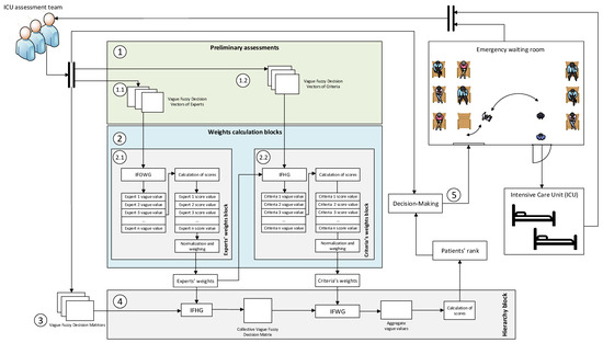 The system described in Section 2.1 considers the different stages that make possible the compilation and processing of the different assessments produced by the sanitary experts from the ICU admittance team, which will be expressed using vague fuzzy numbers [10] because of their proven capabilities to manage vagueness and to represent uncertain information, as well as to control the uncertainty associated to the process itself for the determination of the membership functions. From them, it will be possible to determine the priority of patients by using a series of operators derived from the vague fuzzy set concept as described in Section 1.2.