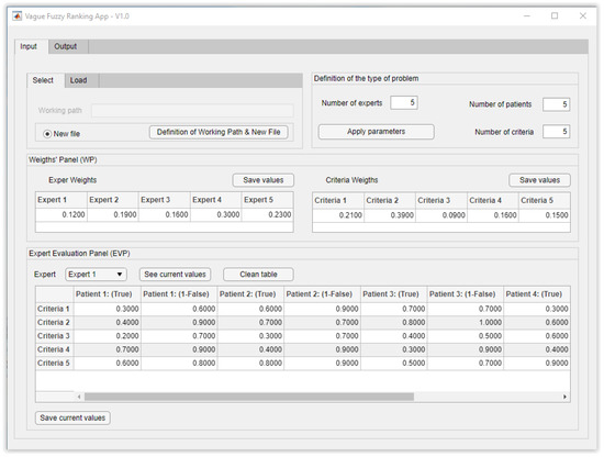 At the same time, the experts will assess the different patients’ status, and each expert’s Vague Fuzzy Decision Matrix is to be filled-in for every patient. As shown in Figure 1, these matrices are first processed by means of the IFGH operator [43], taking into account the expert weightings as for . The Collective Vague Fuzzy Matrix, which represents the joint assessment by the different experts of each one of the patients’ statuses, is obtained as an output of said operator.