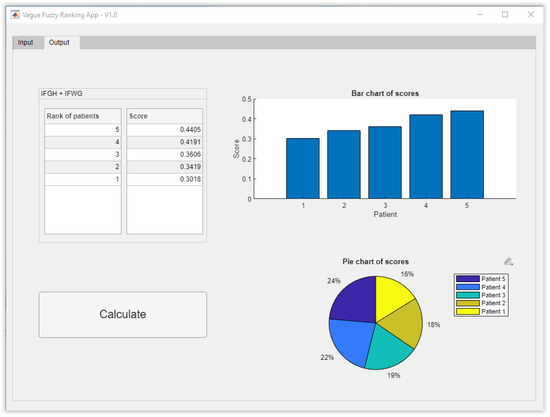 Finally, the score calculation is performed, from which it is possible to determine the patients’ hierarchy. Figure 3 shows the application’s calculation panel in which the hierarchization results can be seen, ranking the patients according to decreasing score values, thus observing that the patient with the highest preference is P5, followed, respectively, by P4, P3, P2 and P1.