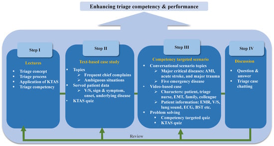Various training methods have been applied to assist triage nurses in making accurate and rapid decisions. According to existing review studies on triage education, the methods used primarily include brief lectures with case studies, simulations, live actors, computerized scenarios, and game-based learning [,,]. Since the goal of triage education is to improve emergency nurses’ competence in making accurate and rapid decisions through various educational methods [,,], there is a need for more efficient and learner-friendly methods to be developed. Countries that have created a representative triage scale offer efficient triage education online []; recently, various techniques, such as virtual reality and augmented reality, have been introduced [,].