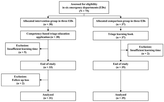 Six EDs in four cities participated in this study from July 2020 to January 2021. The emergency medical system in Korea consists of the regional emergency center (REC), which is in charge of treating critical emergency patients, and the local emergency center (LEC), which is in charge of treating emergency patients in their local area. Of the EDs participating in this study, two were RECs and four were LECs. All EDs have been performing triage using KTAS since 2016. Three EDs each were assigned to the intervention and the comparison group (Figure 3). Thirty-eight emergency nurses were assigned to the intervention group and 37 to the comparison group. In total, 75 emergency nurses in the EDs responded to our online survey comprising six measures—critical thinking, triage competency, triage knowledge, triage performance, demographic factor (age, gender, educational level), and clinical experience (total nursing, emergency nursing, triage) before intervention.