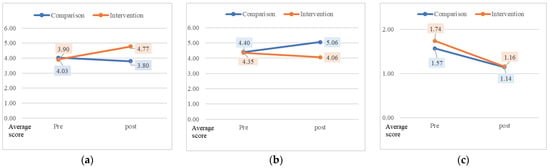 The second hypothesis of this study was that the intervention group participants would show higher triage accuracy than those in the comparison group. When the pre-post triage accuracy of the two groups was verified, the intervention group showed significant improvement (t = 2.11, p = 0.039). To evaluate the cause of triage error, the averages of the two groups’ undertriage and overtriage were investigated and compared (Figure 4). The results revealed a significant reduction in the intervention group’s undertriage error, compared to the comparison group (t = 2.08, p = 0.041). However, both groups showed a decrease in the average of overtriage error.