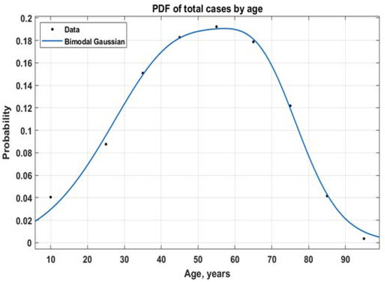 The age groups in the data are 0–19, 20–29, 30–39, 40–49, 50–59, 60–69, 70–79, 80–89, and 90+. We take it from the Open Data Portal [10] and we evaluate by taking the middle of the intervals, with the points 10, 25, 35, 45, 55, 65, 75, 85, and 95 years of age (Figure 1).