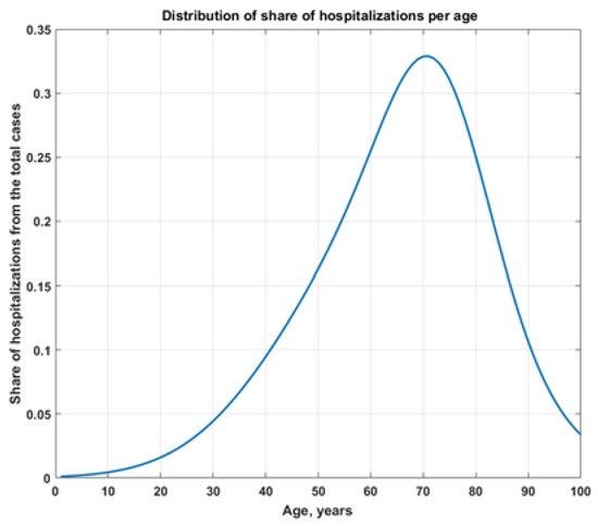 If the distribution of new cases by age is , where is time in a year (age), we can obtain the distributions of the share of hospitalizations by age by multiplying it with the function : (1) gives the risk of hospitalization per age in percentage [11], and we need to normalize (2).