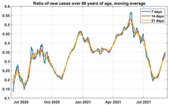 The ratio of people over 60 we calculate for every new day. We differentiate the cumulative cases by age to obtain the daily cases by age, containing multiple periods. We analyzed frequency spectrums of active cases and this ratio to filter that noise and chose 21 days for the moving mean (Figure 3). We used 25 July2021 as the starting point of modeling when the ratio was lowest. The delta variant became dominant in Bulgaria (officially at the beginning of August, but data are delayed 7–14 days). This period of monotonic increase allows us to apply linear regression on cointegrated time series.