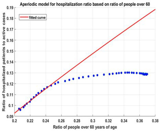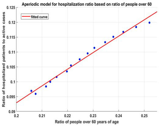 The correlation between the ratio and active cases is very high—95%, due to the stage of growing hospitalizations and growing ratio of 60+. Nonetheless, we need both variables, since we want to check how the coefficient , representing the ratio between hospitalizations and active cases, changes with the increase of . For that reason, we employ principal component analysis and make the regression with the transformed data. We first make a linear model for the whole interval to assess the fit. Then, we will use it by removing data points backward in time—from 3.09 15 points backward as a compromise between the number of observations needed for regression and the number of estimated coefficients.