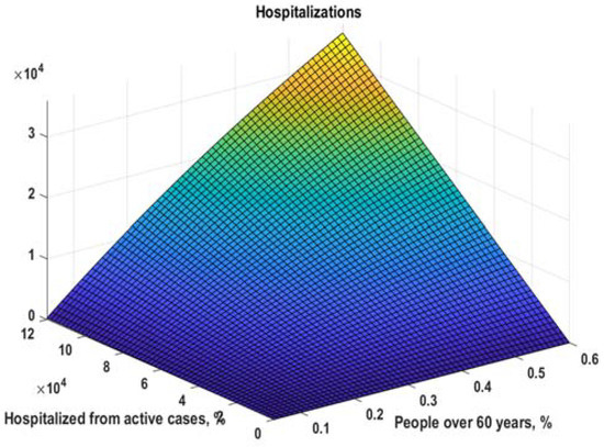 The risk of hospitalization is exponential—e0.044t [11], which allows us to use the population above a certain age threshold and its ratio to the whole population (in the new cases). Getting the mean risk from the integral of (1) divided by the length of the interval (0,100) gives us a mean risk of 18.2843% for the general population group. The mean risk for under 60 is 2.96%, which is under 1/6 of the total risk. For that reason, the ratio of people over 60% is enough to determine the hospitalization risk with good precision, to avoid using the whole distribution, which needs to be obtained from data for each day if we follow the approach, we described in Section 2.1.