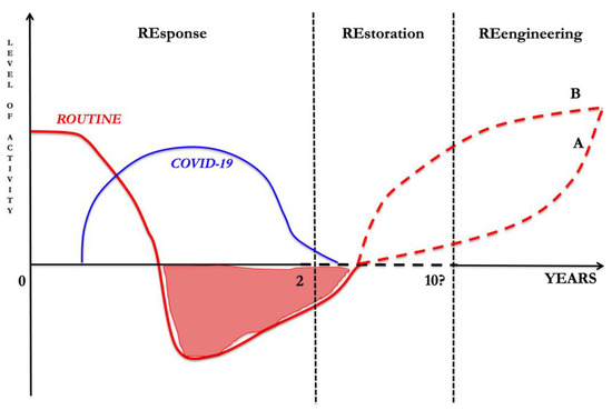 In the figure, the level of routine acitivity (red line) and COVID-19-related activity (blue line) are described over time. During the emergency phase, with rapidly increasing hospital admissions (REsponse phase), routine activity rapidly declined to divert resources to COVID-related activity. During this phase, high COVID-19-related mortality was recorded. In the meantime, chronic disease patients and cancer surgeries received less resources, producing lists of overdue patients. As the pandemic declines, routine activity should be restored to eliminate the backlog. Due to cure delays that occurred in REsponse phase, during the REstoration phase an increased mortality, not directly related to COVID-19 infection, is observed. Meanwhile, long COVID syndromes may increase the number of disabled patients who will likely need additional care. It is difficult to predict how long the restoration phase will last, but taking into consideration other disaster examples, such as Katrina, it is reasonable to think the REstoration phase will take many years. Finally, healthcare systems will be reenginereed (the REengineering phase), with telemedicine probably being widely used to optimize human resources. Whether REengineering will be slower (Curve A) or faster (Curve B) will depend on the ability of national systems to direct flows of resources in an optimal manner. However, the most important issue is that healthcare system managers should draw up a priority list that takes the healthcare needs of citizens into account. In doing so, political counterparts should also direct funds in a targeted, rapid, and precise manner to improve healthcare activities, ideally to overcome any unforeseen circumstances (REengineering phase) [21].