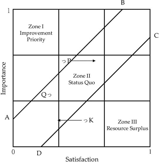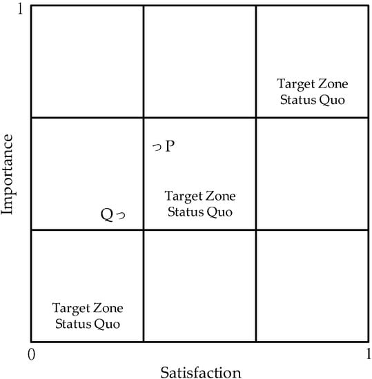 Based on the PEM proposed by Lambert and Sharma [24], it is difficult to objectively determine whether to improve or promote the service items that fall within or close to the “moderate performance zones” (e.g., Coordinates P and Q in Figure 1; [27]). According to Lambert and Sharma [6], Coordinate P, which is in the “status quo zone,” and Coordinate Q, which is in the “improvement zone” (Figure 1), are the main improvement items. However, the positions of Coordinates P and Q in the matrix show that the importance of Coordinate P is significantly higher than satisfaction, suggesting that P should be an improvement item, while the importance and satisfaction of Coordinate Q are similar, suggesting that Q should maintain its status quo [26].