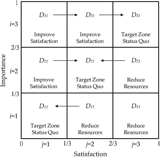 Lambert and Sharma [24] developed a Performance Evaluation Matrix (PEM) that characterized the importance of quality elements associated with logistics services and the performance of the enterprise with regard to these elements (i.e., customer satisfaction). PEMs are similar to importance–performance matrices in that both are two-axis matrices, with performance plotted along the X-axis and importance plotted along the Y-axis. However, PEMs differ in their approach by dividing importance/performance scores into three equal parts to generate more detailed results [25]. Based on these scores, PEMs can be divided into nine zones. The strategic significance and improvement priority of service elements and the strategies needed to improve them may differ depending on their position within the matrix, with the matrix, as a whole, illustrating the importance–performance relationships of various services [26].
