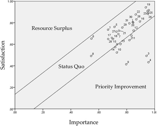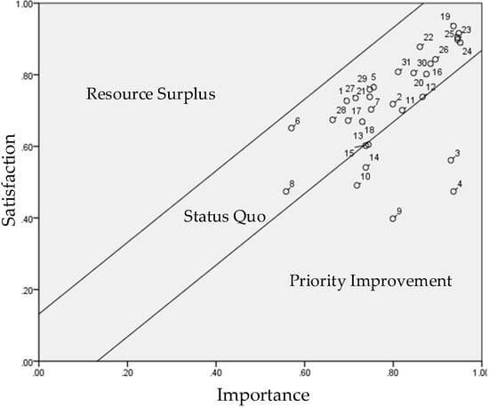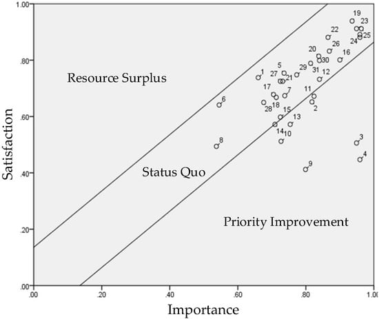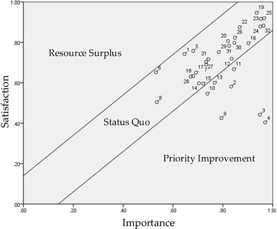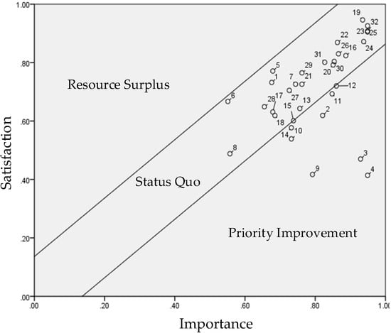 Following the questionnaire survey, data were calculated with Equations (1) and (2) in Table 3. Then the control lines were defined (Table 4) to illustrate in Figure 3, which was used to identify the items in need of improvement.