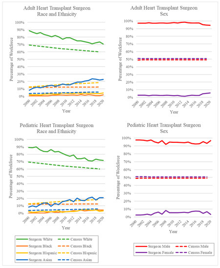 Furthermore, it has been demonstrated that patients undergoing cardiothoracic operations experience sex and racial disparities in care and outcomes [4]. Similar patterns have also been observed among adult patients undergoing heart transplantation (HTx) [5]. Increasing the diversity of the cardiothoracic surgery workforce is one potential approach towards mitigating these disparities. The findings of Greenwood and colleagues have supported this notion by demonstrating that physician–patient racial concordance was associated with improved infant survival after childbirth, which has demonstrable racial disparities in patient outcomes [6]. In a similar study, Greenwood and colleagues found that female patients with acute myocardial infarction treated by female physicians had better outcomes than when treated by male physicians [7]. Moreover, Wallis et al. recently demonstrated that surgeon–patient sex discordance adversely affected outcomes of common surgical procedures [8]. Here, we sought to explore trends in sex and race/ethnicity of surgeons performing adult (≥18 years) and pediatric (<18 years) HTx between 2000–2020.
