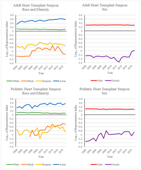 Common logarithm of the representation index by year of surgeons performing at least one HTx. Values greater than zero indicate overrepresentation, and values less than zero indicate underrepresentation. The representation index was calculated with respect to US Census data [11,12].