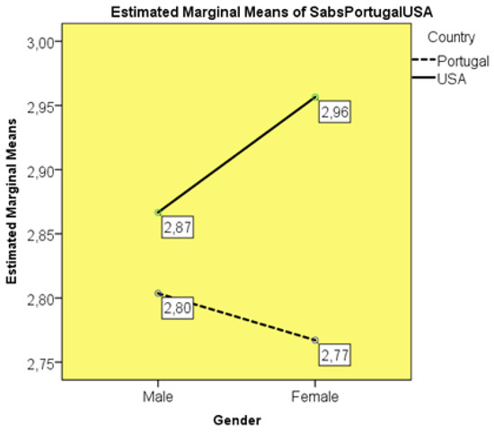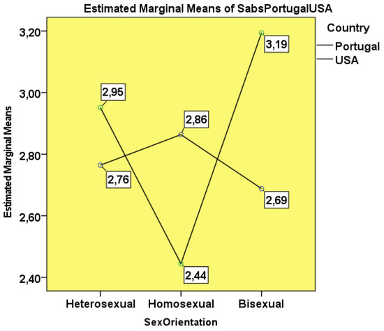 Through a two-factor ANOVA (gender and nationality), having verified the equality of variances by Levene’s test (p = 0.261), it was observed, without significant differences (F(3:292) = 2.119; p = 0.098), that American students had higher mean scores on the SABS (M = 2.91; SD = 0.081) than Portuguese students (M = 2.78; SD = 0.063). Among Portuguese students, females show less conservative attitudes and beliefs towards the sexuality of the patient (M = 2.77; SD = 0.057) than males (M = 2.80; SD = 0.667). However, in American students, males are more liberal in their approach to patient sexuality than females (M = 2.86; SD = 0.410 vs. M = 2.95; SD = 0.608), according to Figure 1.