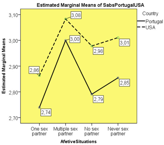 A two-way ANOVA test was performed, using the SABS scale and the students’ nationality and the affective relationships they reported. The homogeneity of variances was verified in Levene’s test (p = 0.945). It was observed without significant differences (F(7:288) = 1.239; p = 0.281), that American students held numerically higher averages in the SABS, that is, more limiting attitudes and beliefs in the approach to sexuality of the patient compared to the Portuguese students (M = 2.98; SD = 0.113 vs. M = 2.84; SD = 0.111). On the other hand, in both nationalities, the most conservative participants in their approach to patient sexuality were those with multiple sexual partners (M = 3.08; SD = 0.415 American; M = 3.00, SD = 0.415 Portuguese). The more liberal participants revealed having only one sexual partner (M = 2.86, SD = 0.087 and M = 2.74, SD = 0.057) (Figure 2).