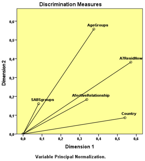 The discrimination measures of the variables residence, affective relationship and nationality have higher values in Dimension 1 (i.e., respectively, 0.571, 0.337 and 0.540).