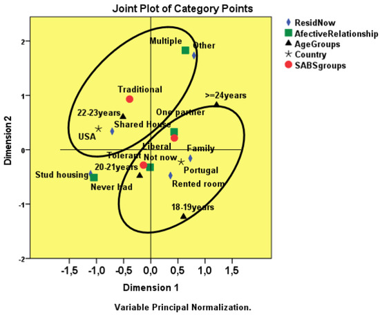 If we remove the gender variable from the analysis, the distribution and grouping of the categories suggests that the American students have a traditionalist profile manifested by students aged 22–23 years, living in rented accommodation with colleagues and with multiple affective relationships. In the Portuguese students, the profile oscillates between liberal and tolerant attitudes toward engaging with the patients’ sexuality, falling into lower age groups, living in a family house or rented room, with no current affective-sexual relationship or with an exclusive partner (Figure 5).