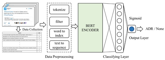 In this study, we adopt BERT as the encoder to develop our approach. BERT, the deep learning technique based on the transformer network architecture, has been pre-trained on a large-scale corpus. The end part of the proposed model is composed with a classifying layer. It can be a simple fully connected layer or a more complicated RNN-like layer. The output layer uses the sigmoid activation function to generate a prediction with a real number between the range of 0 and 1. Here, an output number over 0.5 means that the model will take this observation as an ADR. Figure 1 illustrates the deep neural networks-based architecture of our ADRs classifier. As already shown, before the tweets are sent into the model, each of them is parsed by a data preprocessing procedure, including steps of stop words elimination, html tags elimination, URL links elimination, and tokenization. A vocabulary dictionary is conducted with all corpus terms and each word is turned into a number encoded by the index of the corresponding term in the dictionary. We align all input sentences to sequences of length 32 (the average data length); the over-length sentences are truncated while short sentences padded with zero values. In this network model we use a fully connected layer with size of 768 neurons as the classifying layer.