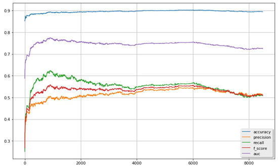 Table 8 lists the experimental results (based on ten independent trials), showing the accuracy, precision, recall, f-score, and AUC. The first three sets of results were obtained from the trials with different deep models described in [54], including CNN (convolutional neural network), CRNN (convolutional recurrent neural network), and RCNN (recurrent convolutional neural network). Meanwhile, this table presents the results produced by various BERT-based methods (i.e., the same architecture with different objective functions). The objective functions include the binary cross-entropy (BCE), the mean square error (MSE), and our proposed approach batch-wise adaptive weighting (BAW). These results show that using the BERT pre-trained architecture can obtain improvement in major metrics (2~6% in accuracy, 1~10% in f-score, and 11~18% in AUC), if compared to other models based on deep learning techniques (i.e., CNN, CRNN, and RCNN). Among others, the proposed BAW method has relatively better performance. To sum up, BAW result has a higher f-score means that the better balance tradeoff between recall and precession can be obtained; and a higher AUC shows that the prediction abilities of the model are consistent at different levels of thresholds.