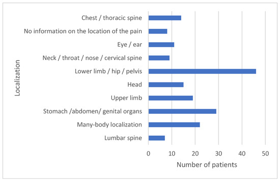The three main reasons for reporting to the emergency department were pain localized at the following sites: lower limb/hip/pelvis (n = 46); stomach/abdomen/genital organs (n = 29); many-body localization (n = 22) (Figure 1).