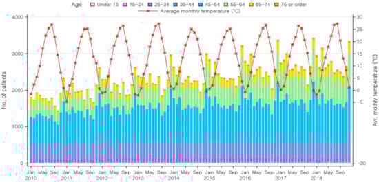 Figure 1 shows a graph of the average monthly temperatures and the number of newly diagnosed patients in Korea in the nine-year period. In general, the number of patients increased with decreasing average monthly temperature, and the number of patients decreased with increasing average monthly temperature. Particularly, the number of patients tended to peak in December, when the temperature drops significantly compared to the preceding month (Supplementary Table S3). Regarding age-related trends, the proportion of 45–54-year-olds and 55–64-year-olds tended to increase steadily every year from 2010–2018, while the proportion of ≤44-year-olds and ≥65-year-olds did not increase noticeably.