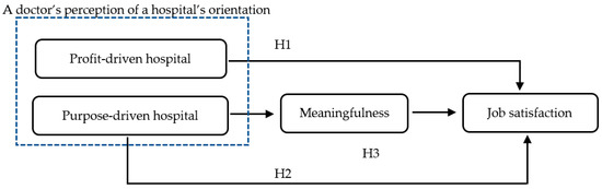 This study further investigates the hidden mediating mechanism through which a doctor’s perception that they work for a purpose-driven hospital leads to job satisfaction. This study proposes that meaningfulness plays a mediating role. Meaningfulness is the core of positive psychology, which focuses on how people prosper as human beings [43,44]. Meaningfulness is “both a cognitive and an emotional assessment of whether one’s life has purpose and value” [45] (p. 506). People feel meaningfulness from the purpose or value of their work, depending upon their psychological properties [46,47]. In the previous literature, meaningfulness has been seen as closely related to job characteristics, work motivation, and engagement at work [46,48,49]. This study extends the boundary of theorizing about meaningfulness by examining whether a doctor’s perception of a hospital orientation is associated with their sense of meaningfulness and subsequent job satisfaction.