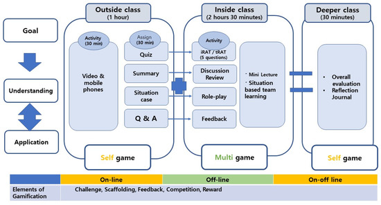 It is essential to understand and empathize with the difficulties patients experience, especially when caring for individuals with mental impairments [16], which requires expertise, and an understanding of nursing intervention approaches appropriate for different situations [17]. Situation-based FL helps students learn diverse content based on specific mental illness cases. In a situation-based FL classroom, students tackle and solve the problems of situation-oriented cases in the classroom based on pre-class preparation through online content [18]. This method can improve students’ problem-solving skills by increasing the opportunities for active interaction between teachers and students [19,20]. Role-play, an element of gamification, can significantly influence understanding and empathizing with the mentally disabled during specific situations [21]. Furthermore, learning from case studies can improve problem-solving abilities and nurture the competencies required for medical professionals.