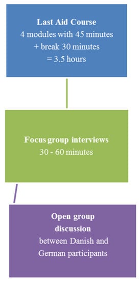 The first plans for the current project were made before the start of the worldwide COVID-19 pandemic. Before the COVID-19 pandemic started, three one-day workshops were planned to be held in the German-Danish border region. These workshops aimed to combine two groups, one in Danish and one in German. Both groups were planned to attend a normal LAC in the language of their choice (Danish or German). Afterward, the participants would be invited to join a focus group interview about their views on the Last Aid course and cultural aspects of end-of-life care. Thereafter, a joint meeting with open discussions among the two groups was planned. However, following the start of the pandemic, meetings with many people and classroom teaching were either very restricted or impossible to perform as planned. Therefore, Last Aid courses in the present study were held in a classroom setting or online due to varying restrictions connected to the COVID-19 pandemic. Material for practical training was sent to the participants of the online LAC prior to the online course. Participants were recruited via a network of cooperating and supporting organizations in Denmark and Germany. Invitations to participate were published in the media using different information channels such as newspapers, radio, and social media channels, including Instagram, Facebook, and podcasts. All interested people were invited to participate and comprised of laypersons without experience in palliative care, experts from the field of palliative care, and representatives from different organizations. The workshops usually lasted one day, including a normal LAC in the morning and a focus group interview in the afternoon, followed by the opportunity to participate in a joint open discussion between the German and Danish participants. Figure 1 provides an overview of the one-day Last Aid workshops.