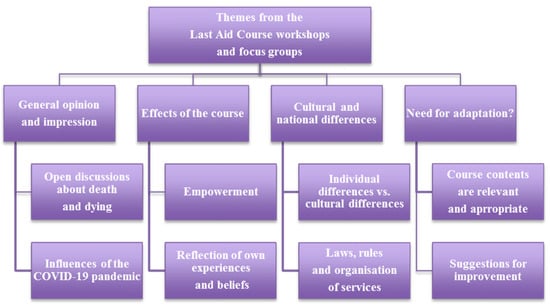 The quantitative data from the current study show that the majority of the participants appreciate both the course and its contents and rate the course modules and content as very good or good (see Table 2). The high acceptance and appreciation of the Last Aid course are similar in all studies that have been undertaken. Both adults and children want to talk and learn about death and dying, and more than 92% would recommend the course to others [,,,,]. In the current study, the informants had a median age of 63 years, 90% (43 of 48) were women, and 30% (13 of 43) had a medical profession. The high percentage of female participants is similar to a large multicenter study from Germany, Austria, and Switzerland with a percentage of 88% []. Currently, the caregiving role in families is still often associated with women, and the results indicate that many women who are caregivers want to be informed and prepared for end-of-life care. This sex disparity is similar to care in dementia and hospices [,]. Interestingly first experiences from Sweden have shown a higher percentage of male LAC participants []. This indicates that efforts should be made to interest more men in participating in Last Aid courses. This can, for example, be done by introducing Last Aid courses in professional education for police officers, a predominantly male profession, as already is ongoing in Scotland and Germany. Compared to previous research, a higher percentage of medical professionals participated in our study. That medical professionals participate in Last Aid courses has been described in different studies, with a percentage of medical professionals ranging from 27% in the first pilot study [] to 9% in a multicenter study with 5469 participants from Germany, Switzerland, and Austria [] whereas the number in present data is 30% of the participants. This shows that nurses and doctors also want to talk about death and dying. The reason for the participation of medical professionals could be both the lack of these topics in professional education or the wish to discuss death from a broader perspective. A recent pilot study has shown that many doctors and nurses are interested in an extended Last Aid course []. The results of the current study indicate that there is a need to respect and talk about cultural differences and individual wishes. The current results indicate that these can be addressed within the normal international Last Aid course curriculum without major changes needed. The most important method to address these challenges is to talk about the topic in the group of participants and to include the different perspectives within the group. Therefore, the Last Aid course instructors/facilitators should address these issues related to local situation, surroundings, and the participants‘ needs and experiences. In order to enable the instructors/facilitators to do that, additional training, reflection, and materials may be used [,].