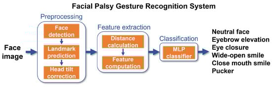 It is out of the scope of this research; however, it is worth mentioning that a complete facial paralysis system should start with detecting facial palsy in a face photograph (or video, depending on the methodology). Then, a classifier trained on healthy people or palsy patients could be selected for the following tasks depending on the detection result. The next module should include the analysis of facial gestures to recognize facial expressions to detect emotion or any other application involving the face. To date, we proposed a system to detect facial palsy in photographs and now an approach to classify facial gestures. Annotated data, including the patient’s emotional state, is needed for the next step.