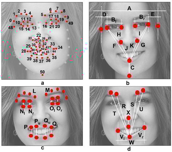 (a) The 51 key points inspired in the 68-point model proposed by Matthews and Baker [23]. (b–d) Facial distances to compute spatial relations between facial landmarks [16].