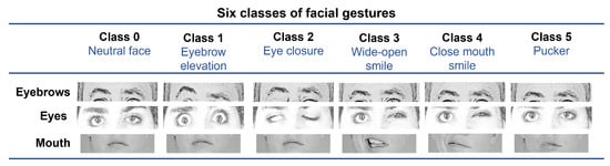 The eight facial movements are grouped into six classes in the proposed approach, as previously shown in Figure 4. Closing the eyes is considered a single gesture since it is not the intention to measure the intensity of the movement, which would be out of the scope of this work. Smiling is split into smiles showing the teeth (wide-open smile) or just enlarging the lips (closed mouth smile); again, measuring the intensity of the gesture is out of the scope. During preliminary tests, we observed that, for a palsy patient, performing a lip depression—which consists of showing the lower teeth—is very similar to a wide-open smile; thus, it was grouped as a single facial gesture.