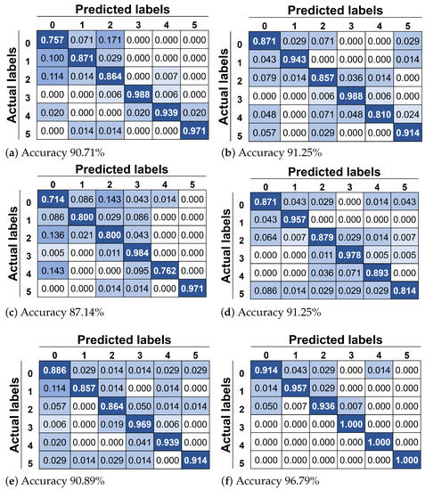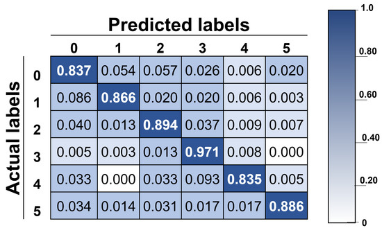 The confusion matrix with actual and predicted labels is introduced in Figure 5, showing the accuracy of the proposed methodology, and by looking into it, it can be observed that the classification system can recognize different facial gestures. The best result is 97.12% for class 3, and the worst is 83.52% for class 4. As mentioned before, the system’s overall accuracy is 90.25%, representing a good result if considering this is a six-class classification system. Furthermore, considering that the baseline accuracy was set at 58.96%, a significant improvement was achieved.