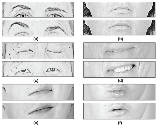 Depending on the palsy severity, this asymmetrical eye-opening could be observed when resting the face. Notice that the photographs represent posed expressions; a different behavior could be observed in in-the-wild images. In Figure 4, the reader can infer that the proposed methodology aims to discriminate among six classes (i.e., rest, eyebrow elevation, eye closure, wide-open smile, closed mouth smile, and pucker).