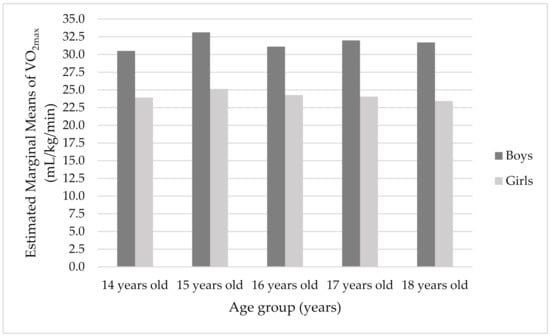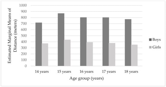 On the other hand, no significant age differences in CRF and distance were obtained in this study when gender, height, and weight were taken as covariance. However, when we look at the results of the two-way ANOVA and the achieved scores by age groups, it can be seen that the age of 15 is the peak of CRF for both boys and girls, and stably declines for boys with age; but declines, then slightly increases at age 17, and stably declines with age for girls (Figure 1). The same trend can be observed in distance measure (Figure 2). The lowest CRF was shown at age 14. CRF is a very important component of children’s health [8,17]. In addition, children and adolescents’ CRF is related to many health outcomes, and consequently with many chronic diseases in adults [8,17]. The estimation of CRF was evaluated by the 20 m shuttle run test. Normally, children and adolescents’ peak VO2 increases through growth and maturation, although there are indications of girls’ peak VO2 being reached at around age 14 [46]. In general, higher values of peak VO2 have been noted in boys [6,46], and sex differences are enhanced as they progress through adolescence. These could be attributed to boys’ greater muscle mass and hemoglobin concentration [46]. Moreover, it could be explained by a slight increase in body fat in boys between 7–12/13 years of age and a reduction in body fat in puberty [36]. These current findings showed the lowest CRF at age 14, but a peak at age 15. After a period of peak values, there was a slight decline in boys, but there was a small increase at girls evident at around age 17, which stably declined after. Similarly, Eisenmann et al. (2011) discovered a slight increase in estimated VO2max of boys aged 12–15 years, which then remained stable. Furthermore, there was a slight decrease in estimated VO2max across ages 12–18 years in girls.