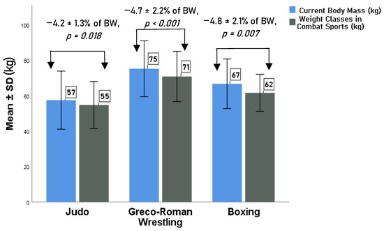 Combat sports athletes most commonly lose ≥ 5% of BW over the seven days prior to weigh-in [1]. According to our data, the average BW loss found before the competition in a sample of the Lithuanian combat athletes varied within the range of 3.1 ± 1.5 kg (4.6 ± 2.0% of BW). It should be taken into consideration that under some conditions, it is allowed to reach from 5% to 8% of BW loss with an acceptable slight effect on the health condition and performance of athletes [34,35]. As the National Collegiate Athletic Association (NCAA) weight loss guidelines stipulate, the Minimum Wrestling Weight (MWW) is grounded on 5% of BF as the lowest BF percentage allowed and the levels of safe weight loss attainable before the first weigh-in procedure at the competition— namely, losing no more than 1.5% of BW per week [36]. In line with the data from our study, male athletes involved in sports such as judo, Greco-Roman wrestling and boxing had a high BF percentage (16 ± 5.4%). Therefore, before competing, the BW of combat athletes can be adjusted as much as possible. On the other hand, the athletes’ LBM was relatively high and led to a high ratio between muscle mass and fat mass (5.7 ± 2.8). Therefore, BW loss should not be a priority for elite athletes in the run-up to the competition.