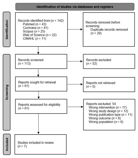 A full search was carried out in different databases, which resulted in a total of 142 articles. Then, a filtering of duplicate articles was performed, leaving 113 unique articles. The titles and abstracts of these 113 articles were then reviewed, which left 61 articles as potentially eligible. Only 7 articles met the inclusion criteria [33,34,35,36,37,38,39], as the other 54 were excluded (Figure 1). 1 article [40] appeared to meet the inclusion criteria judging by its title and abstract. However, upon closer reading, the article was excluded because its results were not related to general cognition.