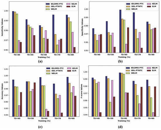 Result analysis of IDLDMS-PTC technique under different sizes of training set: (a) sensitivity, (b) specificity, (c) accuracy, and (d) F-score.