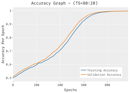 The accuracy of the IDLDMS-PTC approach under training set (80:20) data is portrayed in Figure 4. The results demonstrated that the IDLDMS-PTC technique accomplished improved validation accuracy compared to training accuracy. It can also be observed that the accuracy values get saturated with the count of epochs.