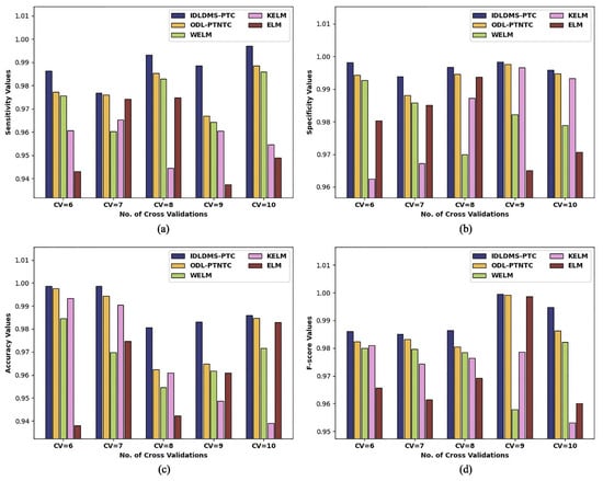 Table 2 and Figure 6 report the overall classification outcomes of the IDLDMS-PTC with existing techniques under varying sizes of CV. The experimental outcomes indicate that the IDLDMS-PTC algorithm obtained effectual outcomes under distinct CVs. For instance, the IDLDMS-PTC model obtained a higher average of 0.9884 where the ODL-PTNTC, WELM, KELM, and ELM approaches achieved minimum average values of 0.9788, 0.9738, 0.9571, and 0.9557, respectively. Followed by that, the IDLDMS-PTC model gained an increased average of 0.9965 where the ODL-PTNTC, WELM, KELM, and ELM approaches provided decreased average values of 0.9938, 0.9819, 0.9813, and 0.9789, respectively.