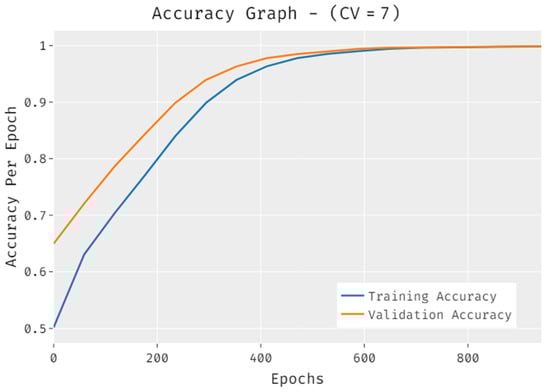 The accuracy outcome analysis of the IDLDMS-PTC technique under CV of 7 data is illustrated in Figure 7. The results demonstrate that the IDLDMS-PTC technique accomplished improved validation accuracy compared to training accuracy. It is also observable that the accuracy values get saturated with the epoch count.