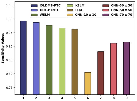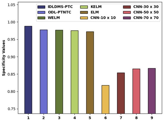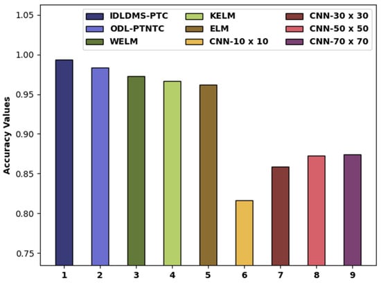 In order to further ensure the betterment of the proposed model, a detailed comparative study of the IDLDMS-PTC approach with recent approaches is offered in Table 3 [23,24,25,26]. Figure 9 portrays the examination of the IDLDMS-PTC technique with existing approaches. The figure defined that the CNN-10x10 and CNN-30x30 models obtained lower values of 0.8050 and 0.8810, respectively. Afterward, the CNN-50x50 and CNN-70x70 techniques attained slightly increased values of 0.9110 and 0.9150, respectively. In line with, the WELM, KELM, and ELM models resulted in moderately closer of 0.9776, 0.9666, and 0.9627, respectively. Though the ODL-PTNTC model accomplished near optimum of 0.9873, the presented IDLDMS-PTC methodology reached a maximum of 0.9935.