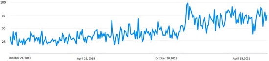 Number of searches for the term “meditation” between 2016 and 2021 in Spain. Source: Google Trend.
