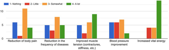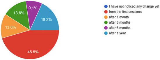 As shown in Figure 6, these beneficial health effects were perceived from the first sessions by 45.5%, and only 18.2% took more than a year to become aware of them.