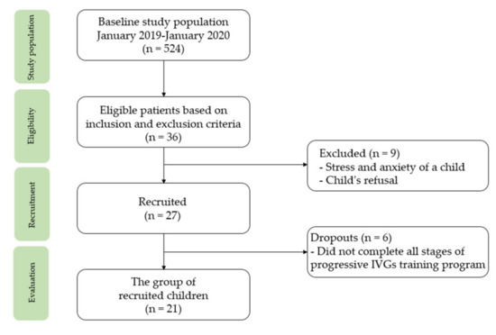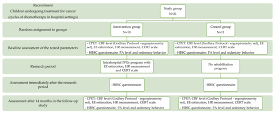 The selected sample included children diagnosed with acute lymphoblastic leukemia (ALL) or acute myeloid leukemia (AML) during hospitalization; the disease period did not exceed 6 months from the diagnosis. Patients were included from January 2019 until January 2020. The study participants comprised children undergoing treatment for cancer (cycles of chemotherapy in hospital settings) at the Department of Pediatric Bone Marrow Transplantation, Oncology and Hematology at the Wroclaw University Clinical Hospital, Poland. We recruited a group of 21 children aged 7–13 years (12 boys, 9 girls) undergoing treatment for ALL (n = 13) and AML (n = 8). The children were randomly assigned to the intervention and the control groups. The subjects from the intervention group participated in IVGs in the intrahospital intervention program. The children from the control group were not included in any rehabilitation program. The children from the control group reported no possession of any interactive video game kit. Not all of the recruited children completed the research program (Figure 1). The distribution of the recruited children into the intervention and the control groups allowed for checking whether the participation in the IVGs program improved their health behavior and regular physical activity level. Additionally, it was possible to assess whether the acquired health habits were permanent and whether they significantly improved the efficiency parameters of the children.