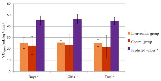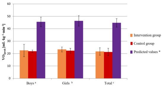Baseline level of VO2peak after the research period in the intervention and control groups compared to the predicted values for age and sex in boys, girls, and all children. Unpaired t-test: a values for boys in the intervention group vs. predicted values (p = 0.0001), values for boys in the control group vs. predicted values (p < 0.0001), b values for girls in the intervention group vs. predicted values (p < 0.0001), values for girls in the control group vs. predicted values (p = 0.0002), c values of the intervention group vs. predicted values (p < 0.0001), values of the control group vs. predicted values (p < 0.0001). * Based on age- and sex-predicted values [34].