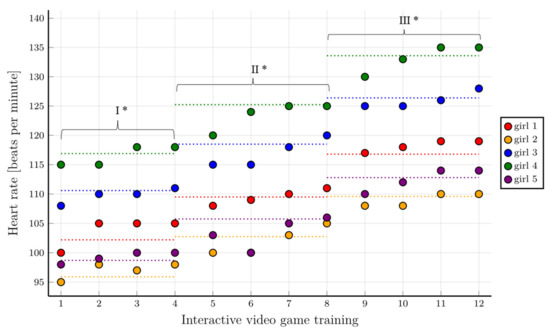Heart rate values at different training stages in the group of girls with consideration given to individual training phases. * First level of difficulty of the game—70% HRpeak; second level of difficulty of the game—75% HRpeak; third level of difficulty of the game—80% HRpeak. The horizontal dotted lines show the range of heart rate values to be achieved for a given training phase.