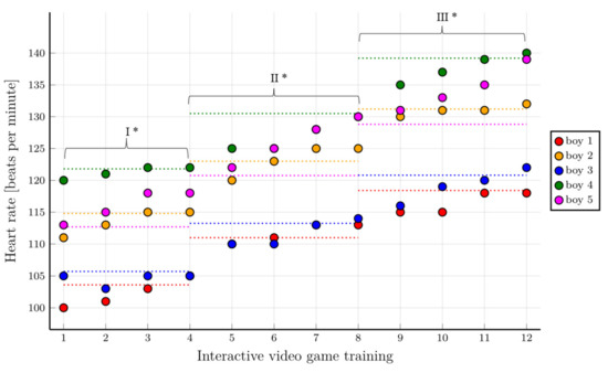 Heart rate values at different training stages in the group of boys with consideration given to individual training phases. * First level of difficulty of the game—70% HRpeak; second level of difficulty of the game—75% HRpeak; third level of difficulty of the game—80% HRpeak. The horizontal dotted lines show the range of heart rate values to be achieved for a given training phase.